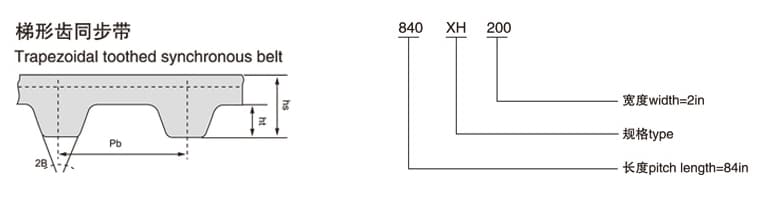 齒型 節距pb 齒高ht 帶厚 hs 角度 2B° 規格表